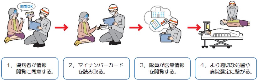救急現場において救急隊員が傷病者のマイナ保険証(健康保険証として利用登録したマイナンバーカード)を活用し、搬送先医療機関の選定などに役立つ情報を把握することにより、救急業務の円滑化を目指す取り組みです。